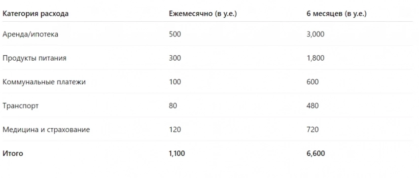 Таким образом, при ежемесячных базовых расходах в 1 100 у.е., ваша подушка должна составлять около 6 600 у.е. для уверенности на полгода.