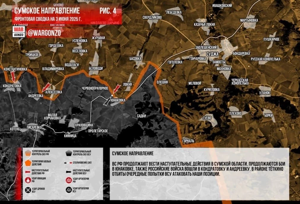 На Сумском направлении ВС РФ продолжают вести наступательные действия в Сумской области. Продолжаются бои в Юнаковке, также российские войска вошли в Кондратовку и Андреевку. В районе Тёткино отбиты очередные попытки ВСУ атаковать наши позиции.