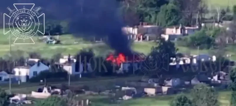 В сети показаны кадры атаки по пункту управления БПЛА противника. В результате точных попаданий наших дронов, первый из которых угодил в крышу, здание, где размещался ПУ врага, вспыхнуло ярким пламенем, да и выгорело дотла.