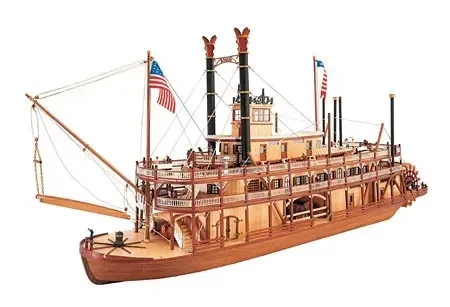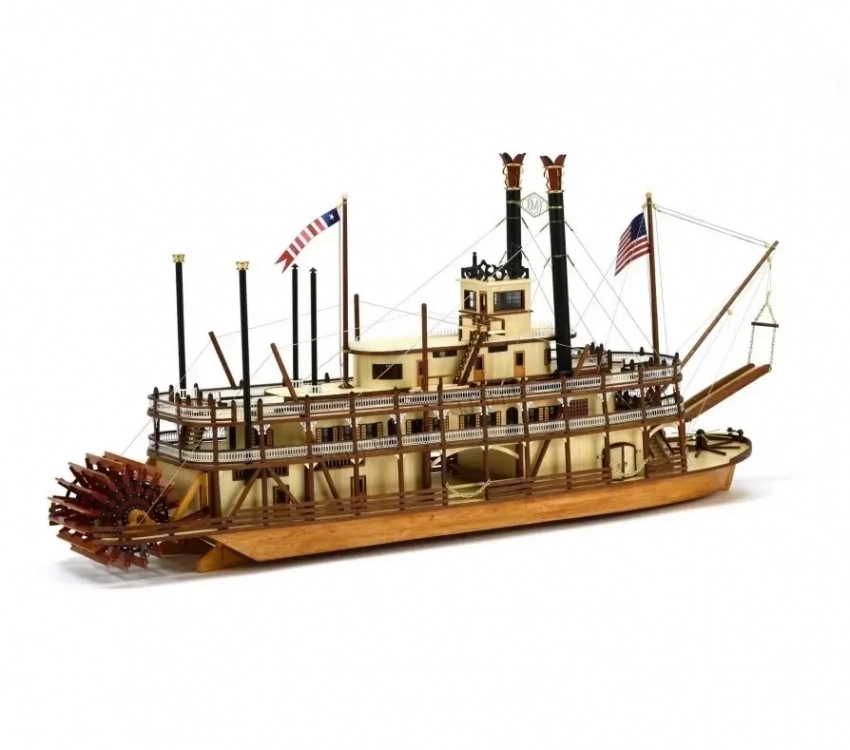 Артефакты истории техники. В прошлый раз мы рассказали о миссисипских пароходах-гигантах. Сегодня наш рассказ будет посвящен их моделям в том числе, причем моделям не из полистирола, а из деревянных полуготовых деталей, над которыми придется потрудиться, но и выглядят они куда более впечатляюще. В предыдущей статье мы уже приводили пример с несколькими полистироловыми моделями парохода «Роберт Е. Ли». Однако его модель итальянская фирма «Амати» выпускает и в виде сборной модели из дерева, причем в масштабе М:150. Цена модели довольно велика и на сегодня составляет около 37 300 рублей – то есть сумму совсем немаленькую.