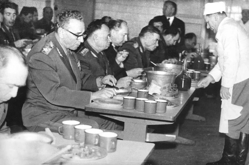 Столовая была двухэтажной. На первом этаже малый зал, на втором — основной, обеды в котором устраивались даже для высшего командного состава Советской Армии: министра обороны СССР маршала Советского Союза Андрея Антоновича Гречко, начальника Главного политического управления Алексея Алексеевича Епишева и командующего ВДВ СССР Василия Филипповича Маргелова.
