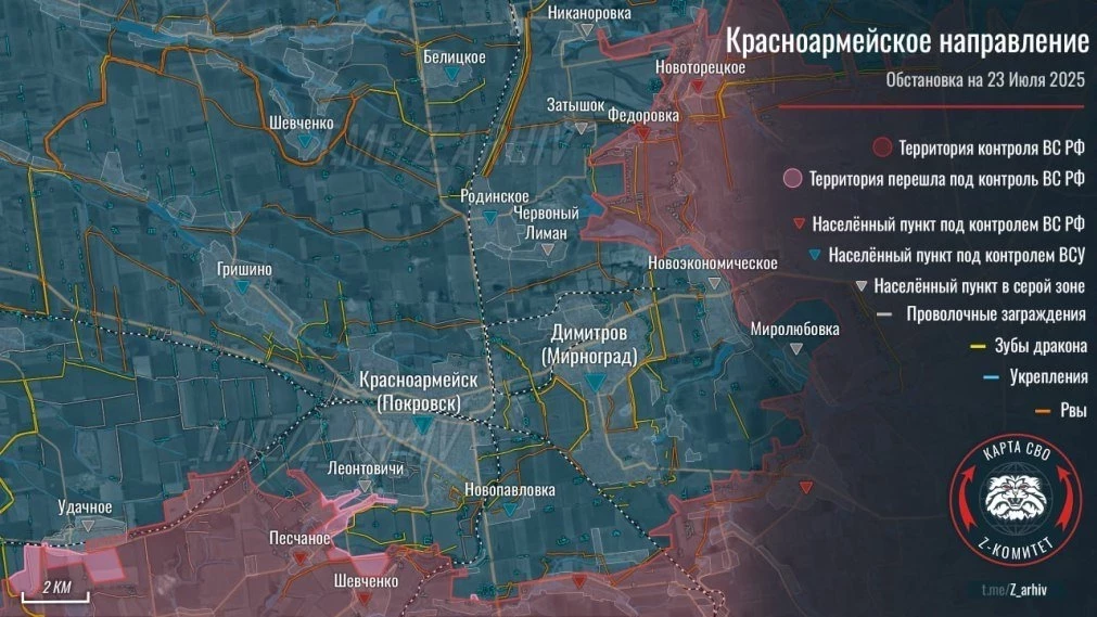 На Покровском направлении фиксируется продвижение между Орехово и Алексеевкой, идут бои за Котлино и в районе Леонтовичей, Удачного, Шевченко. Зверево в серой зоне.