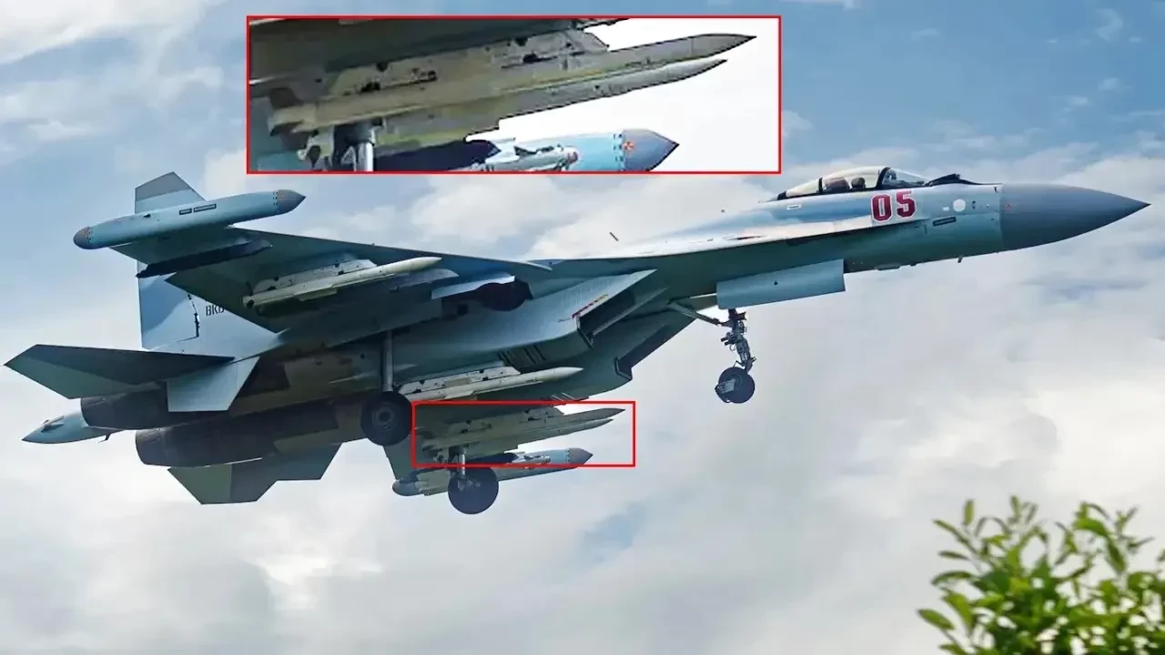Как указывается, на фотографии, недавно появившейся в соцсетях, изображён многоцелевой истребитель Су-35С с двумя Р-77М на пилонах, расположенными под воздухозаборниками. При этом стандартные Р-77-1 закреплены на центральных узлах подвески под консолями крыла. Истребитель также вооружён одной УРВВ с ИК-наведением серии Р-73/74, размещенной под левой консолью крыла, и блоками РЭБ на законцовках.