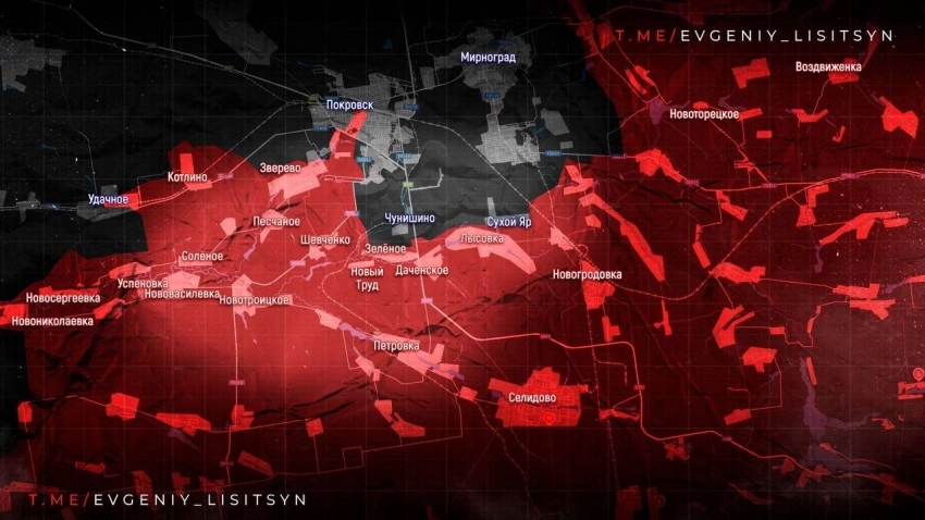 На западном фланге Покровского направления ВС РФ атакуют к Гришино - оттуда и из Доброполья ВСУ тянут резервы, чтобы не допустить оперативного окружения гарнизонов в Мирнограде и Родинском. Несмотря на то, что ВСУ смогли потеснить ВС РФ во Владимировке, где идут ожесточённые бои, наши вбивают клин между Новое Шахово и Шахово. Продвинулись к Белицкому, установив огневой контроль над дорогой в Мирноград. Обошли Никаноровку и заняли южную часть Мерцалово. Взяли Сухецкое и шахту «Краснолиманская», ведут бои на восточных подступах к Родинскому, а также на окраинах Красного Лимана. Продвижение армии России на этом участке отрезает Покровск от стратегического района обеспечения из Славянска - Дружковки - Константиновки, создаёт условия для глубокого охвата с запада самой Константиновки. Ниже по фронту наши войска вышли на северо-восточную окраину Мирнограда, выбивают ВСУ из посадок в районе Балаган-Московское-Проминь.