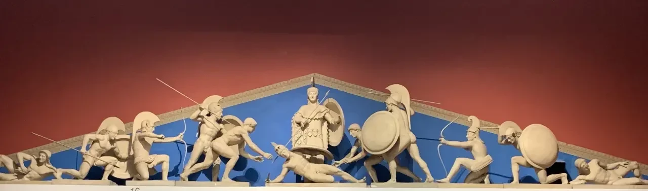 Переходим в залы со скульптурами Древней Греции, и там их столько, что просто разбегаются глаза. Но начнем мы с реконструкции западного фронтона храма богини Афины в Ахайе на острове Эгина. В Пушкинском музее его можно увидеть как целиком, так и в виде отдельных скульптур, входящих в его общую композицию. Вот так он выглядел в дни «своей молодости»…