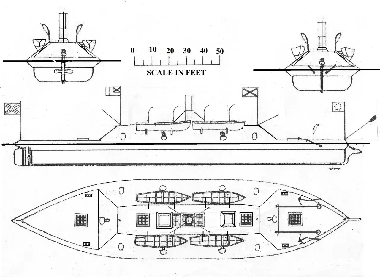 Боковые и задняя стенки каземата и основания кожухов гребных колес корабля защищались всего одним слоем плит толщиной 50 миллиметров. Чтобы повысить снарядостойкость, им был придан уклон в 35 градусов к горизонтали. Подобная защита толщиной не более 50 миллиметров уже считалась недостаточной для защиты от мощных орудий северян, но южане, страдавшие от крайнего дефицита металла, не имели особого выбора. Частично слабость брони компенсировала мощная деревянная подкладка из 600 миллиметров тика.