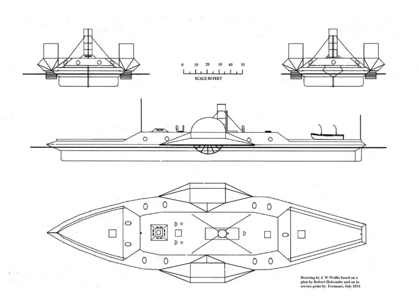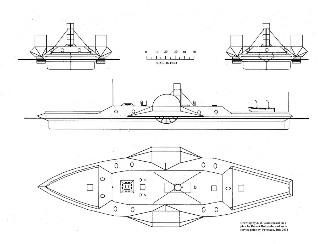 Длина его составляла 48,82 метра, ширина — 11 метров, и осадка — до 2,59 метров. Полное водоизмещение броненосца было 677 тонн. Он был полностью построен из железа, без какого-либо применения деревянных конструкций; корпус его был собран из пяти больших железных отсеков, произведённых отдельно и собранных на верфи. Сами орудия были типичными гладкоствольными дульнозарядными орудиями Дальгрена, стрелявшими ядром весом до 75 кг, фугасной бомбой весом до 70 кг, шрапнелью и разного размера картечью. Их дальность составляла до 3650 метров при угле возвышения до 15 градусов. Для того времени это были достаточно мощные орудия, способные (с небольшой дистанции) пробивать наклонную 100-миллиметровую броню конфедеративных броненосцев. Так что очень даже оригинальных кораблей хватало и у южан, и у северян!