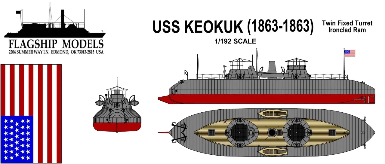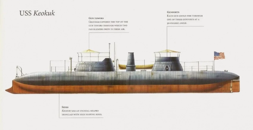 Совершенно необычным был и броненосец северян монитор «Кеокук». Весной 1862 года, после успешной демонстрации возможностей броненосцев в бою на Хэмптонском рейде, военно-морской флот США начал в спешном темпе заказывать новые броненосцы, торопясь ввести в строй возможно большее число кораблей. Инженер Чарльзом Уитни в сотрудничестве с Томасом Роулендом предложили оригинальный проект, обещая построить корабль за пять месяцев. Строить его начали под именем «Мудна», но перед спуском на воду корабль переименовали в «Кеокук», в честь города на территории штата Айова.