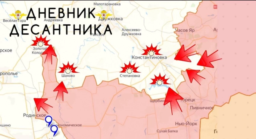 На Константиновском направлении к северу от Полтавки и Русин Яра позиционные бои. Продолжается сражение за Катериновку и Клебан-Бык южнее водохранилища. МО РФ сообщило об освобождении Александро-Шультино, от которого до окраин Константиновки менее 5 км. ВКС РФ уничтожили ФАБом базу размещения техники и личного состава СБУ между Дружковкой и Краматорском.