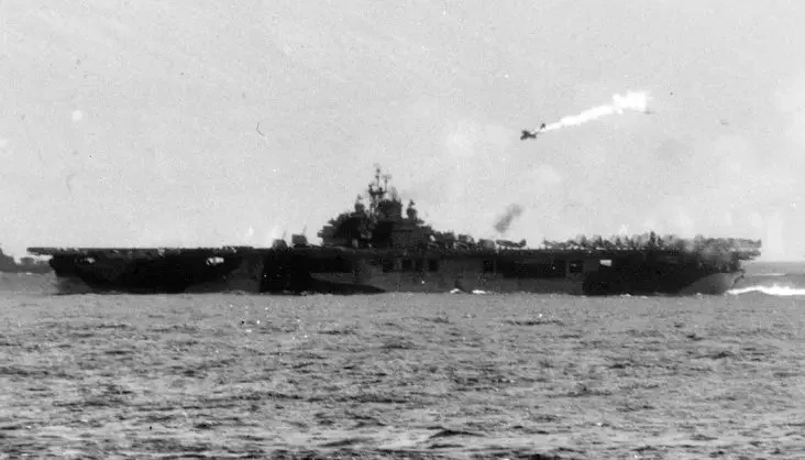Горящий самолет камикадзе пикирует на американский авианосец «Эссекс». Ноябрь, 1944 г.