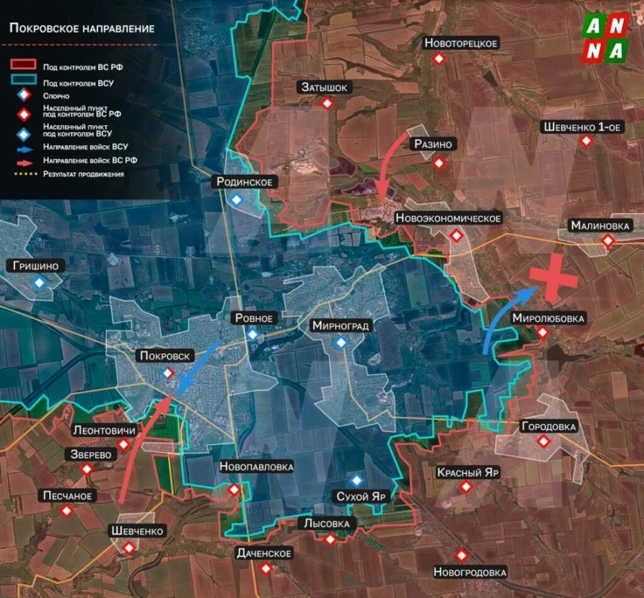 На Покровском направлении ожесточённые бои на южном фланге. В районе Удачного ВС РФ атакуют и продвигаются, бои идут южнее Молодецкого. Интенсивное сражение продолжается в районе Леонтовичей и Троянды. Позиционные бои в районе Сухого Яра и Чунишино. На восточном фланге, по сообщениям с мест, в Мирном противник не закрепился и понёс потери. В районе Михайловки идут бои, достоверных данных о ситуации нет. На северном охвате встречные бои идут в районе Рубежного, Золотого Колодезя и Грузского. Очень интенсивное сражение идёт по периметру Шахово.