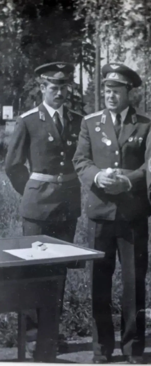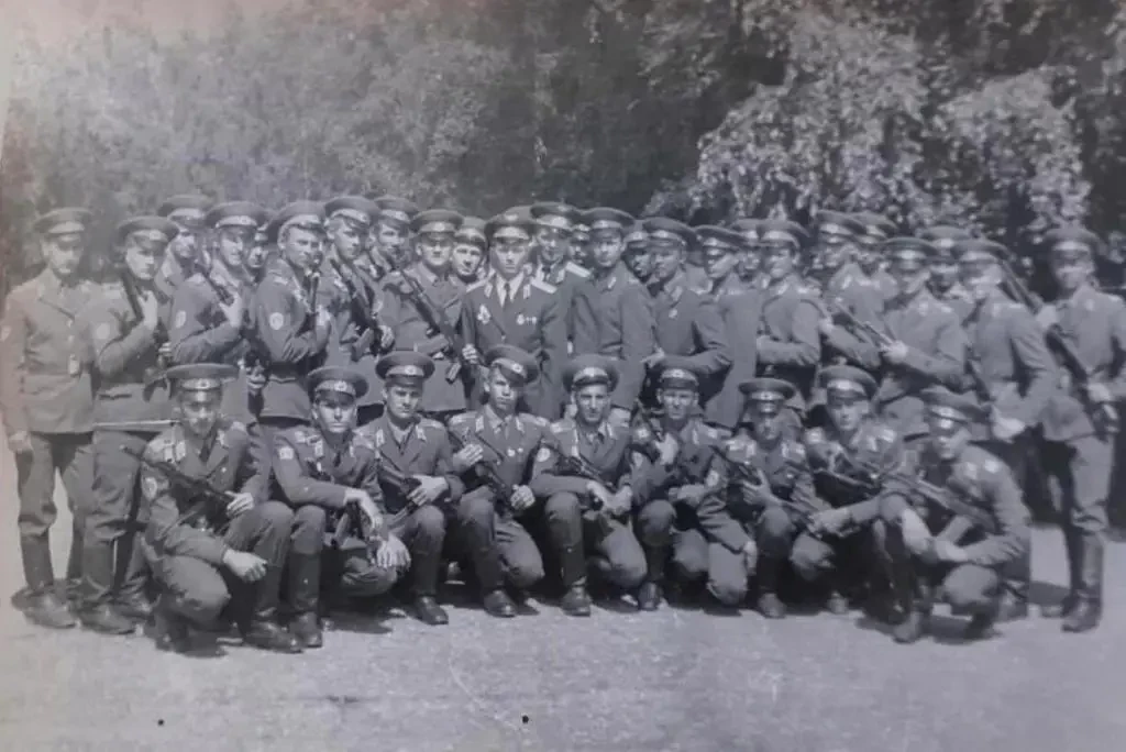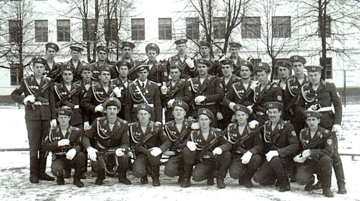 Лето 1979 года. 7-я парашютно-десантная рота 350-го гвардейского парашютно-десантного полка. Фото после принятия присяги молодым пополнением – на фотографии в основном именно пополнение, прибывшее из учебного центра дивизии. В центре стоит командир роты, гвардии старший лейтенант Валерий Евгеньевич Евтухович; за ним старшина роты, гвардии прапорщик Александр Адамцевич. Сидят: второй слева сержант Владимир Кузнецов, второй справа сержант Николай Сакович, остальные в ряду – молодые бойцы