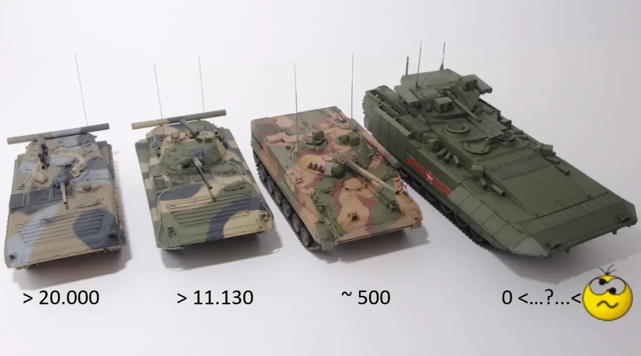 Немного истории с примесью экономических возможностей страны, которую мы потеряли. БМП-1 создавалась в эпоху идей «ламаншизма» с перспективой, если понадобится, «вымыть солдатские сапоги в Индийском океане». Машина выпускалась с 1966 по 1983 годы в количестве более 20 тысяч. С 1968 по 1991 годы выпущено более 10 тысяч САУ 2С1 «Гвоздика». Но апогеем милитаризма, наверное, становится танк Т-72 в количестве около 30 тысяч в период с 1973 по 2005 год (пять танков за два дня в мирное время).