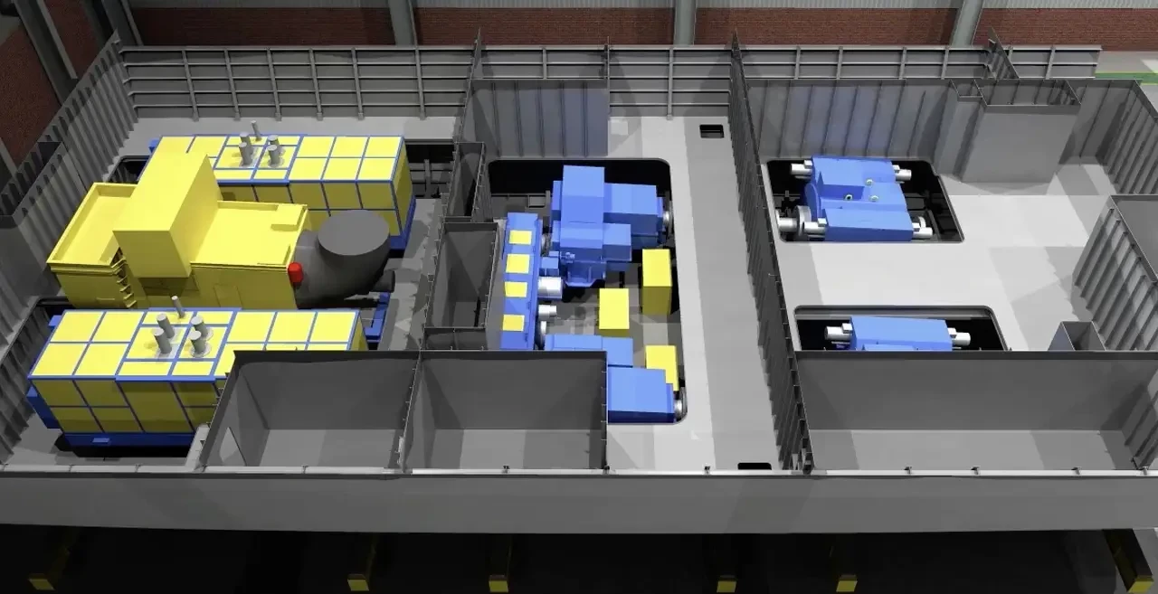 Компьютерное изображение машинных отделений фрегата Type 26. Жёлтые параллелепипеды в клеточку – это дизель-генераторы, между ними находится газовая турбина. Центральный отсек – это помещение редукторов, а справа – гребные электродвигатели. Дизель-генераторов четыре штуки, ещё два прячутся где-то в другой части судна