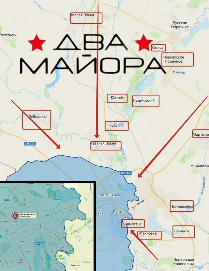 С мест приходят неподтверждённые пока сообщения о боях в районе центрального рынка в Судже, а также о продвижении наших бойцов по улицам Щепкина и первого мая в центре города. Подтверждение этих данных будет говорить о том, большая часть города уже освобождена. Пока ВСУ сохраняют присутствие в пригородах Гончаровка, Заолешенка и Заолешенский.