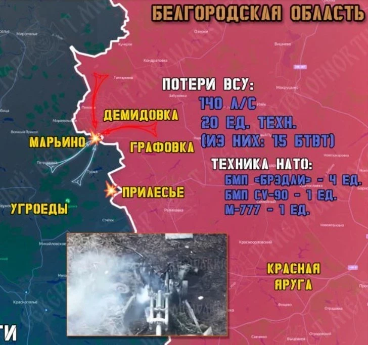 В Белгородской области в течение дня враг упорно пытался зайти в Демидовку со стороны Марьино Сумской области Украины. С утра атаковали двумя БМП «Брэдли» с десантом под прикрытием двух танков, в течение дня использовались квадроциклы с пехотой ВСУ. Но дальше «зубов дракона» пройти у ВСУ не получается, их атаки раз за разом захлёбываются под ударами нашей артиллерии и дронов.