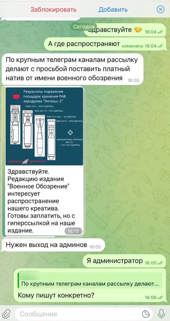 Суть попытки состояла в следующем: украинские ЦИПсО, представляясь сотрудниками ТГ-канала «Военного обозрения», предлагали за плату разместить в ТГ «креатив», представляющий собой фейковые новости. При этом для реализации своего замысла – с целью прикрыться «Военным обозрением» - делали запрос на возможность публикацию гиперссылки на наш реальный канал в других ТГ-каналах - как якобы на первоисточник.