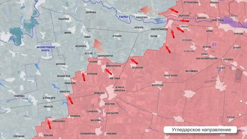 На Угледарском фронте армия России продолжает продвижение в районе Вольного Поля и Весёлого. Судя по отдельным текстовым заявлениям с мест, наши штурмовики вышли на окраины Разлива.