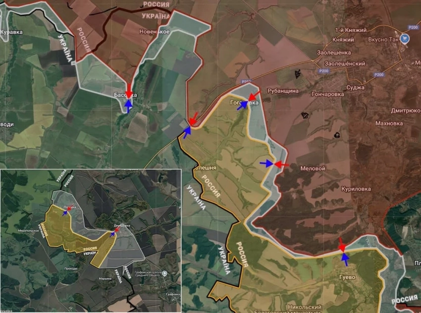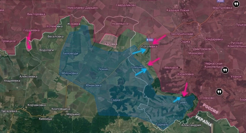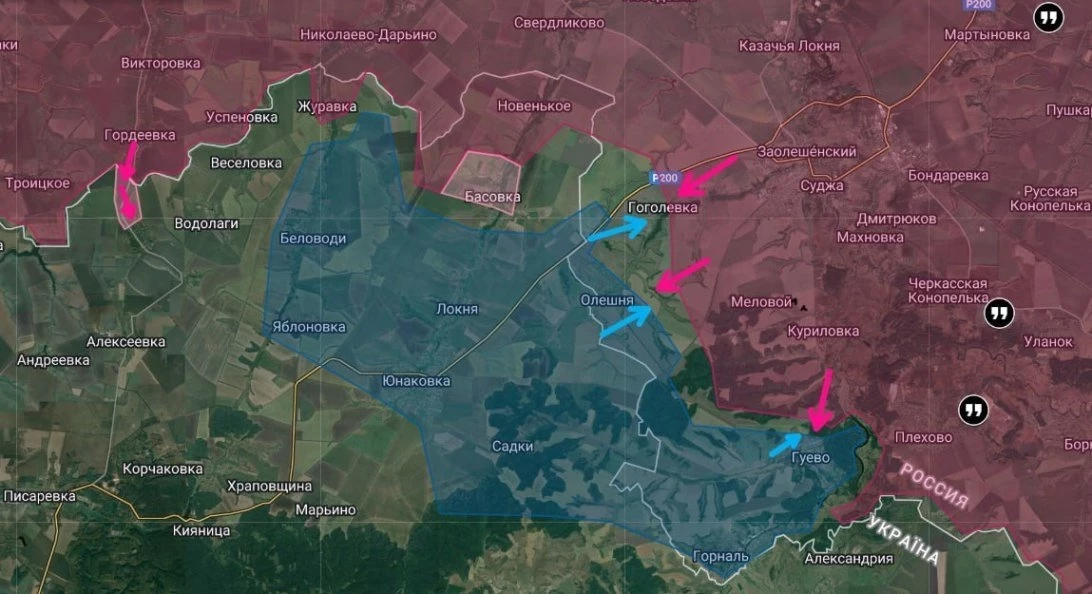 Также пришло известие об окончании зачистки Гоголевки и выходе наших к границе и на этом участке. Таким образом, под контролем ВСУ остаются только небольшой участок у Олешни, на подступах к которой тоже идут бои, и заминированные лесистые участки у Гуево и хутора Горналь.