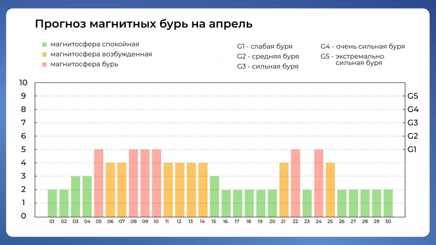 Составлен календарь, в какой день на Землю обрушатся магнитные бури в апреле-2025. График составлен на основе данных Лаборатории солнечной астрономии ИКИ и ИСЗФ РАН.