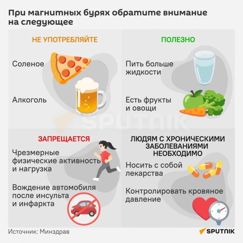 Учёные могут точно прогнозировать магнитные бури только на несколько часов вперёд, поэтому важно заранее позаботиться о здоровье. Во время геомагнитной активности могут возникать упадок сил, головные боли, смена настроения и боли в суставах.