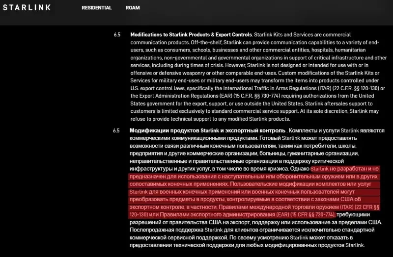 По сути, указанные пункты обязывают пользователя согласовывать с правительством США любое использование оборудования Starlink в составе каких-либо изделий, используемых как оружие.