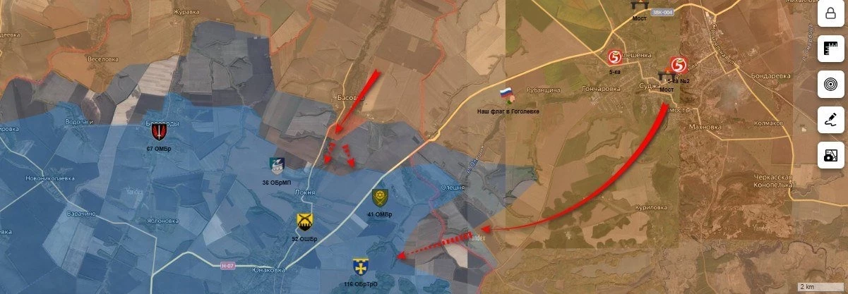 В Курской области ВСУ контролируют узкую полоску у границы около Олешни и Гуево. Наши наступают на хутор Олешня, уничтожают огневые точки врага и подходят к окраинам.