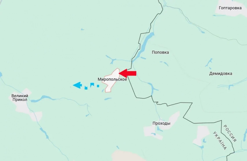 От Миропольского ВСУ вынуждены отходить западнее – в направлении населённого пункта с интересным названием Большой (Великий) Прикол. Тот случай, когда «прикол» действительно большой – ВСУ шли на территорию Белгородчины, а теперь командованию приходится латать дыры по направлению к Сумам. От Миропольского до областного центра около 29 км.