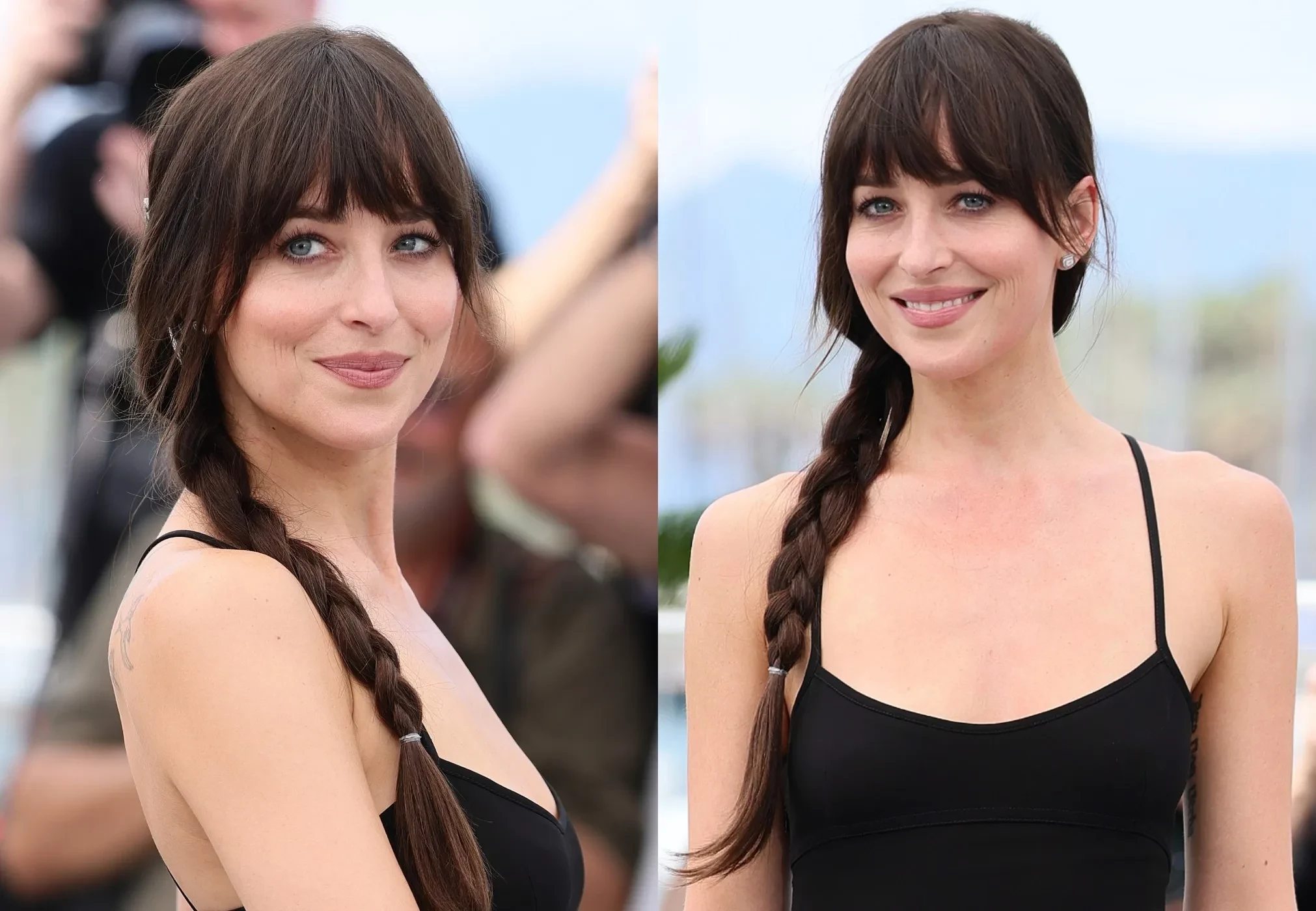 Возлюбленная Криса Мартина пришла на мероприятие в чёрном облегающем платье Gucci на бретелях и босоножках на каблуке. Дакота дополнила образ серьгами-гвоздиками и причёской с косой.