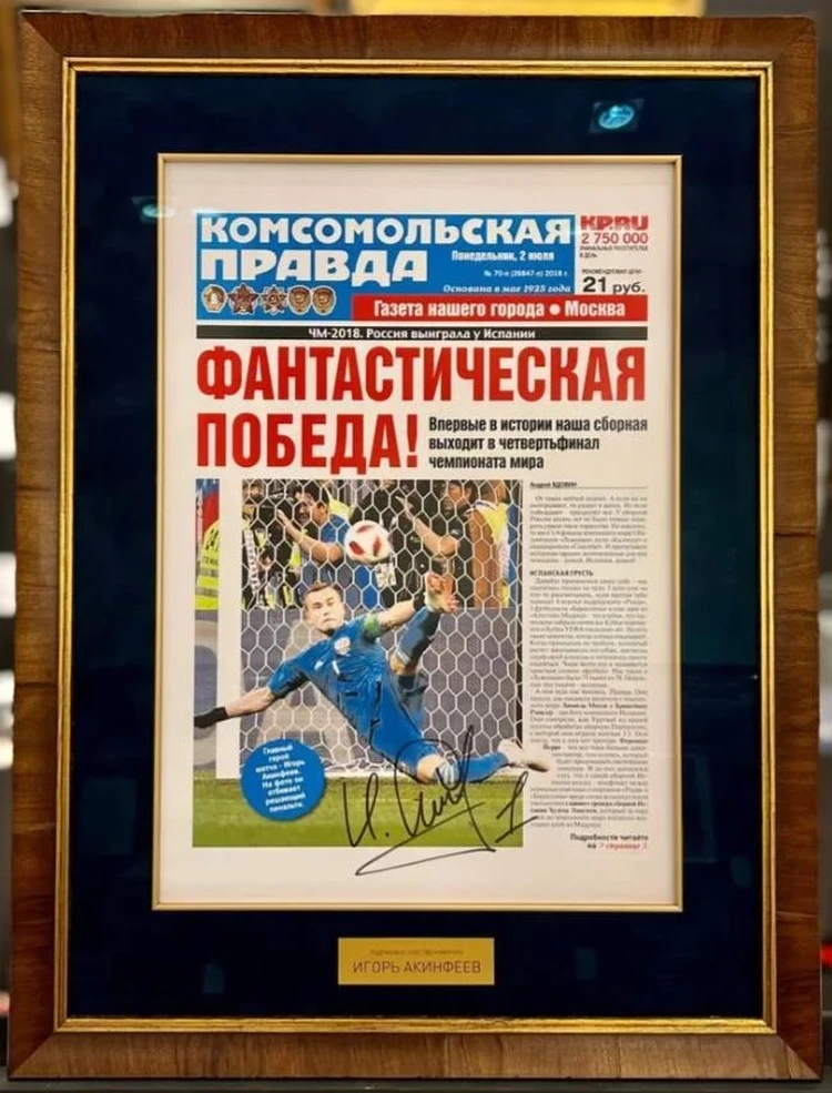 250 тысяч рублей – Автограф футболиста Игоря Акинфеева на обложке «Комсомолки», посвященной победе над Испанией в ЧМ-2018 благодаря вратарской «Ноге бога».
