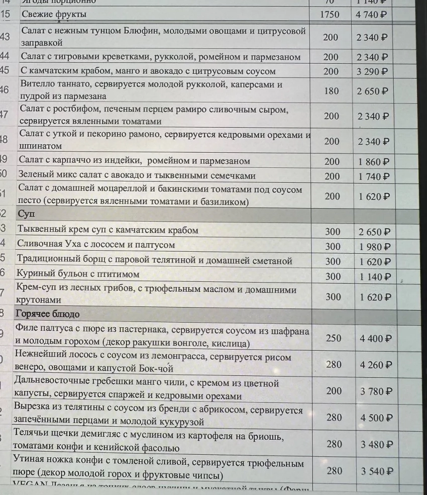 Так, в этом году цена небольшого канапе с ветчиной в меню составила 540 рублей, а 70 граммов салата "Цезарь" — 780 рублей. Самой дорогой оказалась телятина с перцами и кукурузой (4 500 рублей), чуть дешевле — филе палтуса с пюре из пастернака: 4 400 рублей за 250 граммов. Стоимость десертов составила 470 рублей — за эти деньги можно будет купить всего 50 граммов "Медовика" или "Наполеона".
