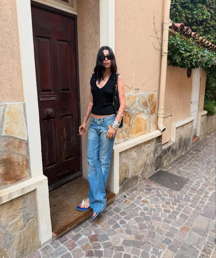 По Ницце Эрика гуляет в платье в горошек, джинсах и вьетнамках, дополнив образы сумкой Yves Saint Laurent.
