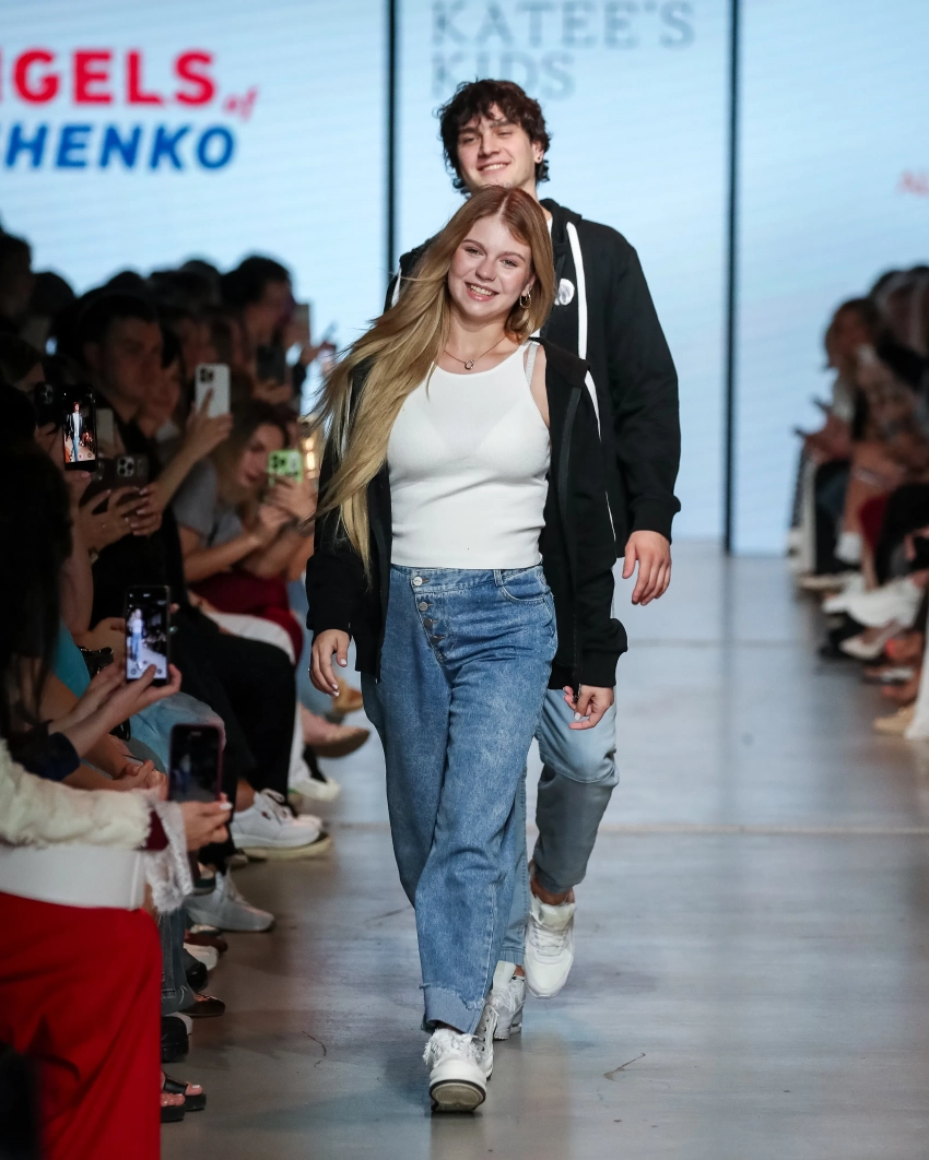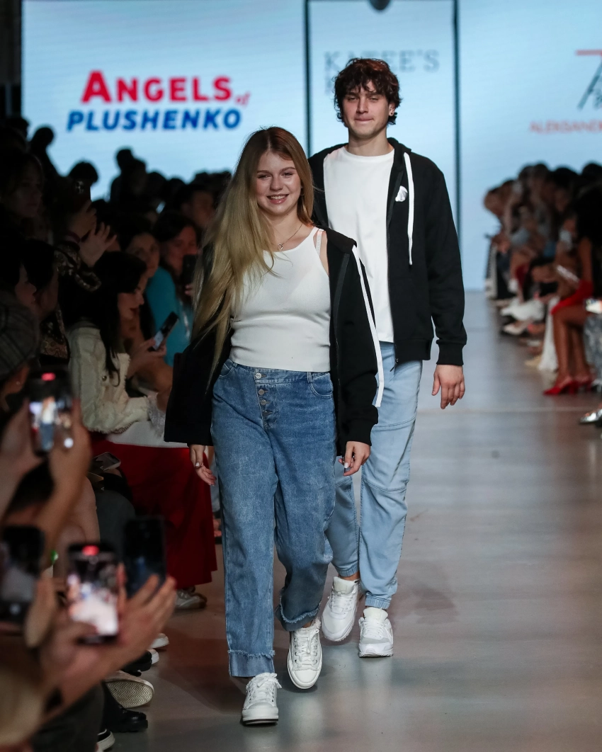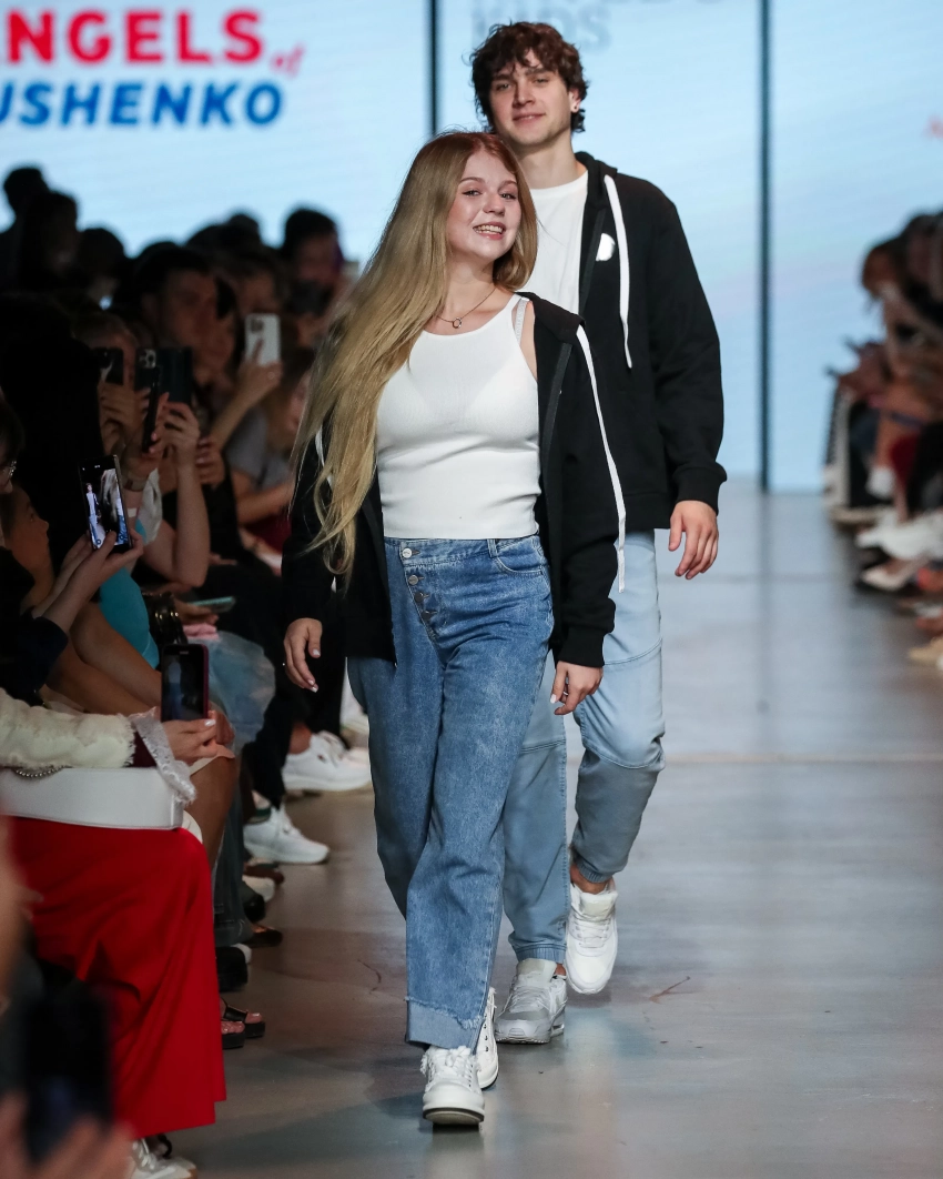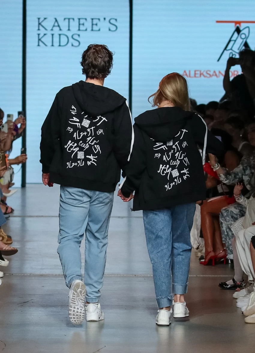 Молодая мама с улыбкой на лице вышла на подиум в самом финале показа. Она представила образ с голубыми джинсами, белой майкой и толстовкой. Муж Александры шёл позади неё в таком же, парном образе.