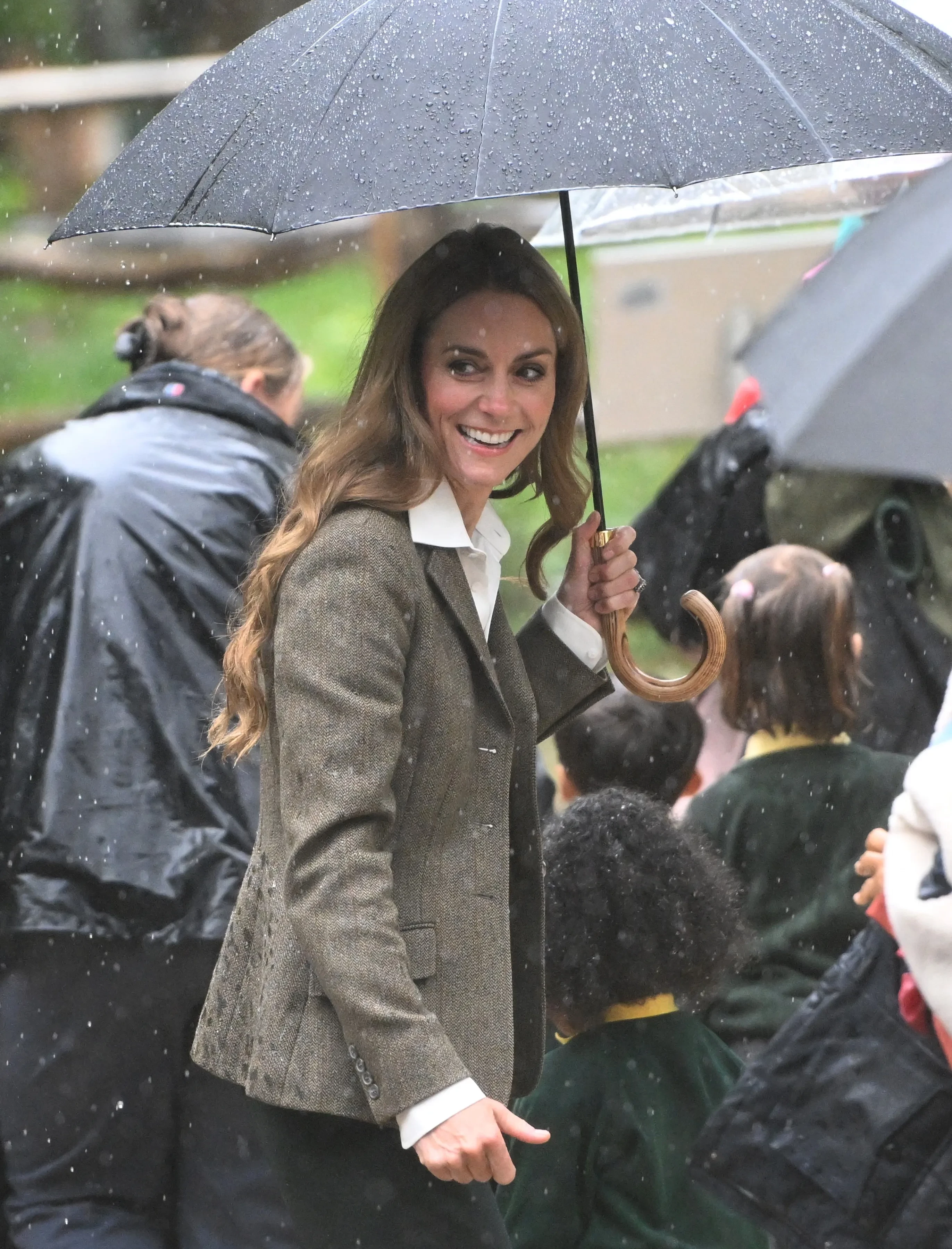 Кейт Миддлтон и принц УильямСтоит отметить, что когда во время мероприятия пошёл дождь, укладка принцессы стала больше похожа на ту, какой все привыкли её видеть. Поэтому, возможно, вместо использования парика стилист Кейт просто переборщил с лаком для волос.