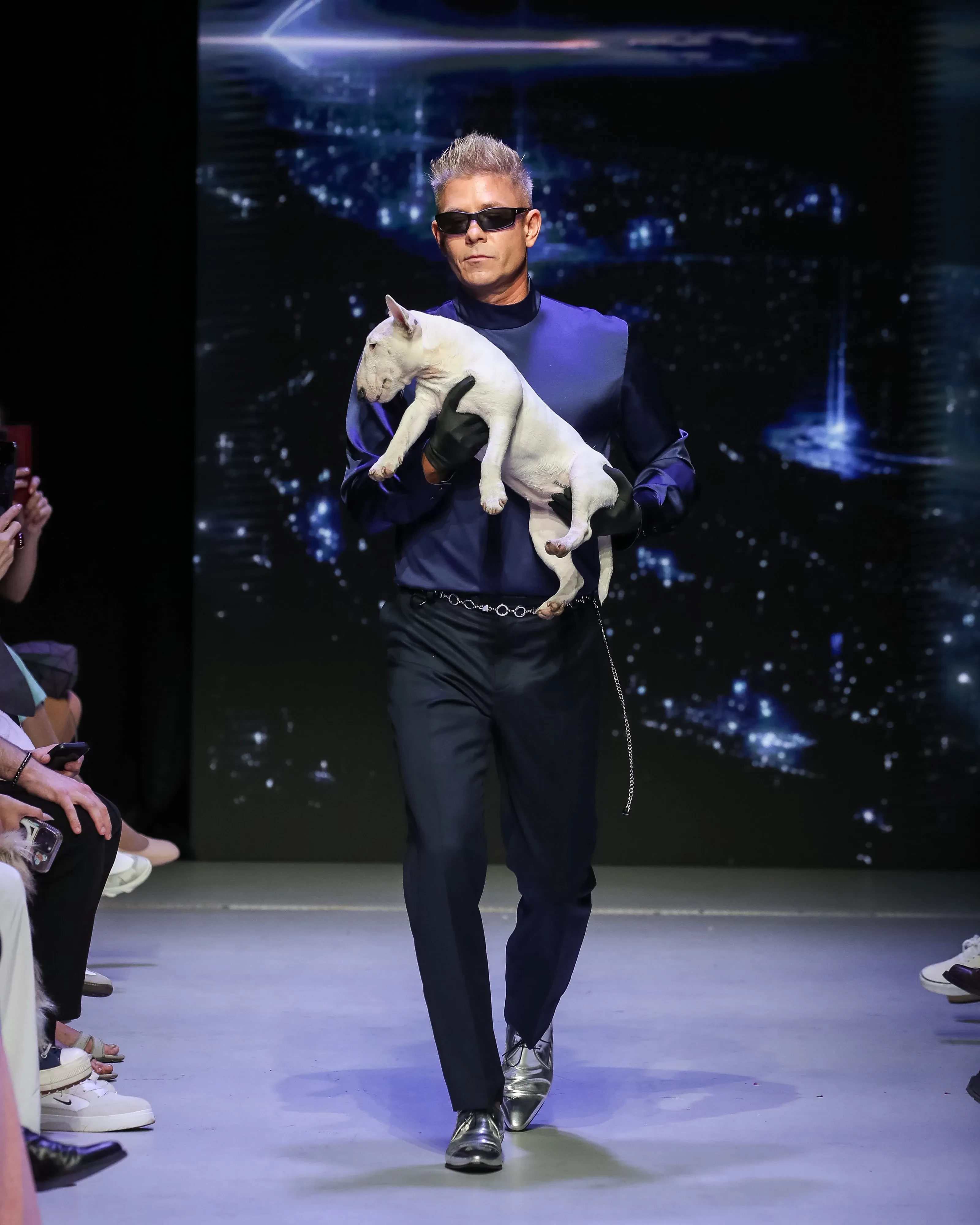 Показ MasterpeaceКроме этого, запомнился показ Roshi. Московский бренд показал коллекцию, вдохновлённую футуристичной архитектурой. Дизайнер сделал акцент на костюмах и верхней одежде, добавив комплекты из плотного хлопка и кожи с геометричными линиями. В коллекцию вошли кожаные платья, рубашки прямого кроя и свободные косухи. Финалом показа стало появление певца Мити Фомина, который вышел на подиум вместе со своим питомцем.