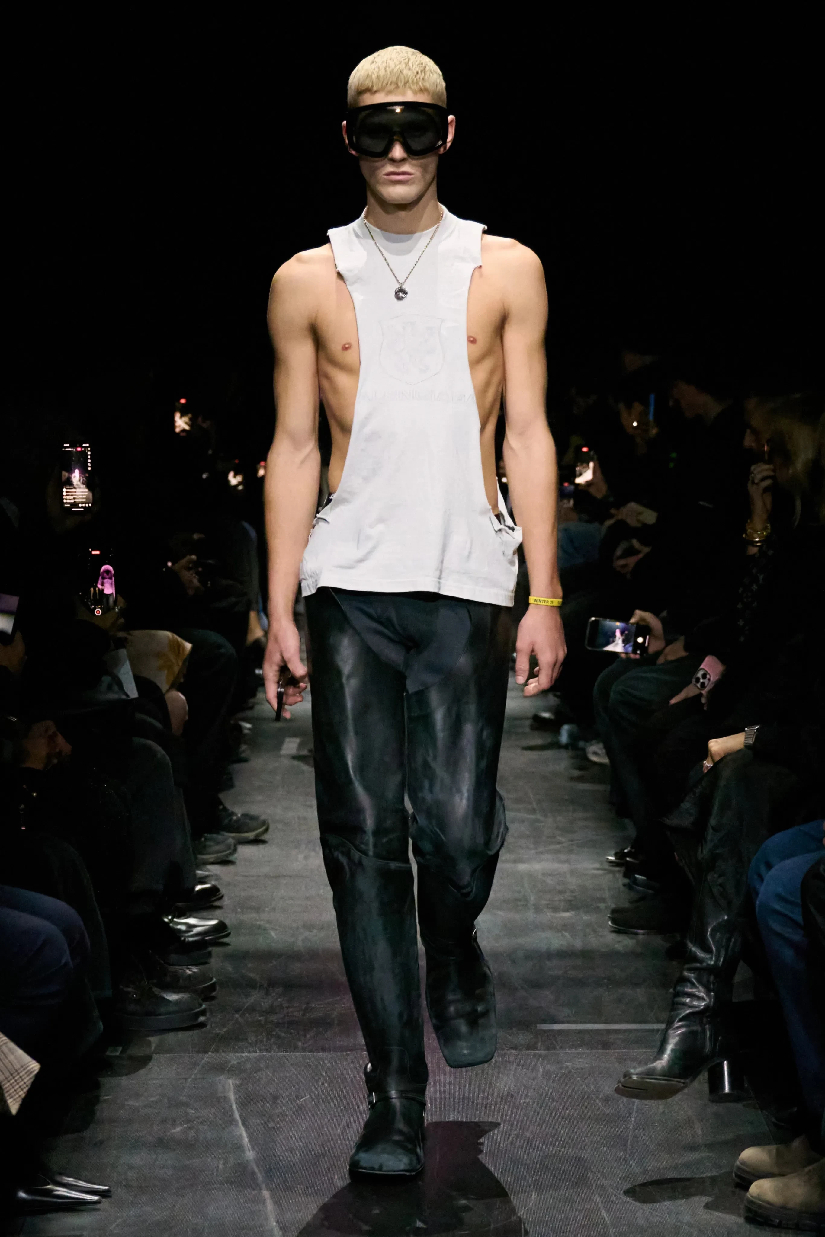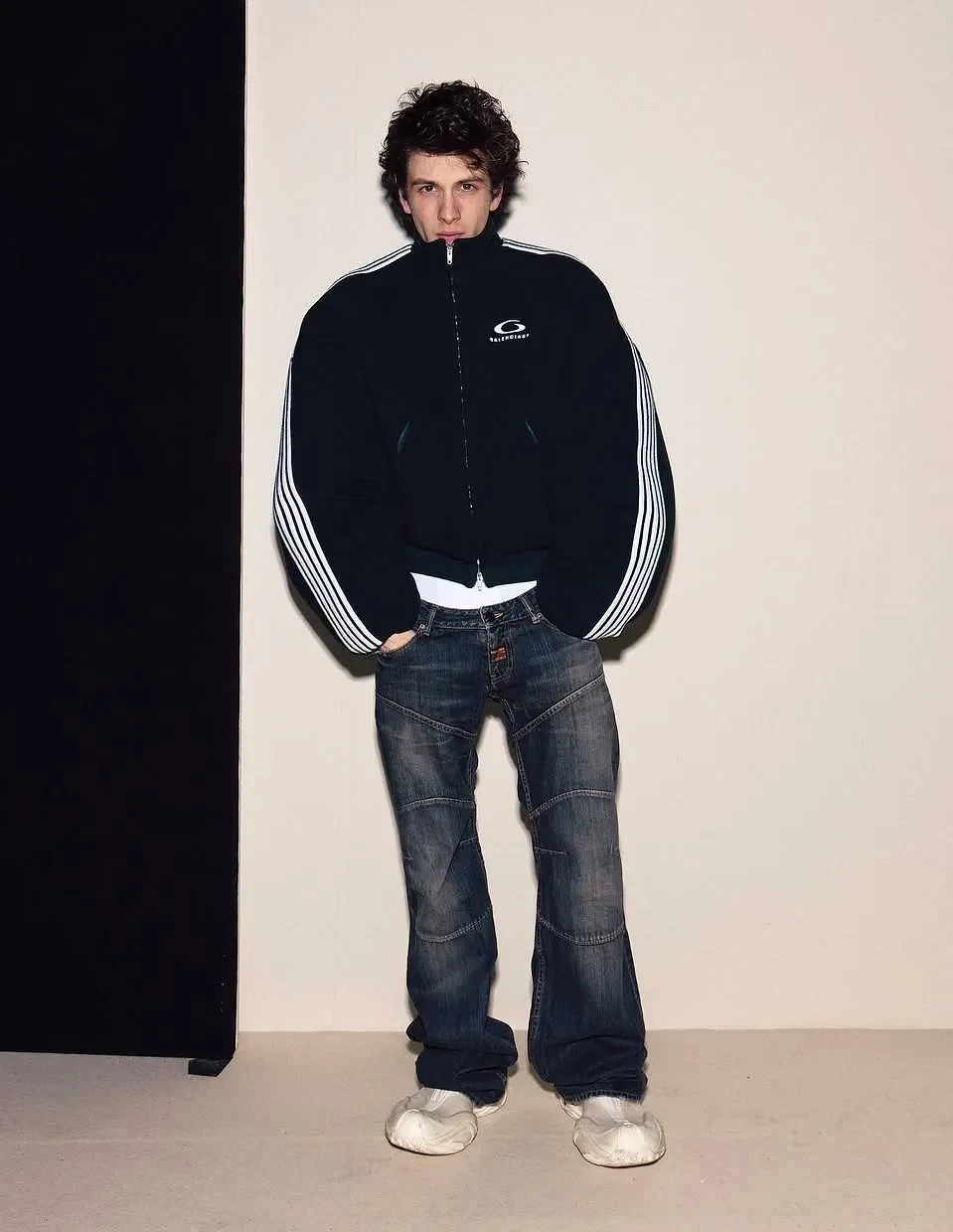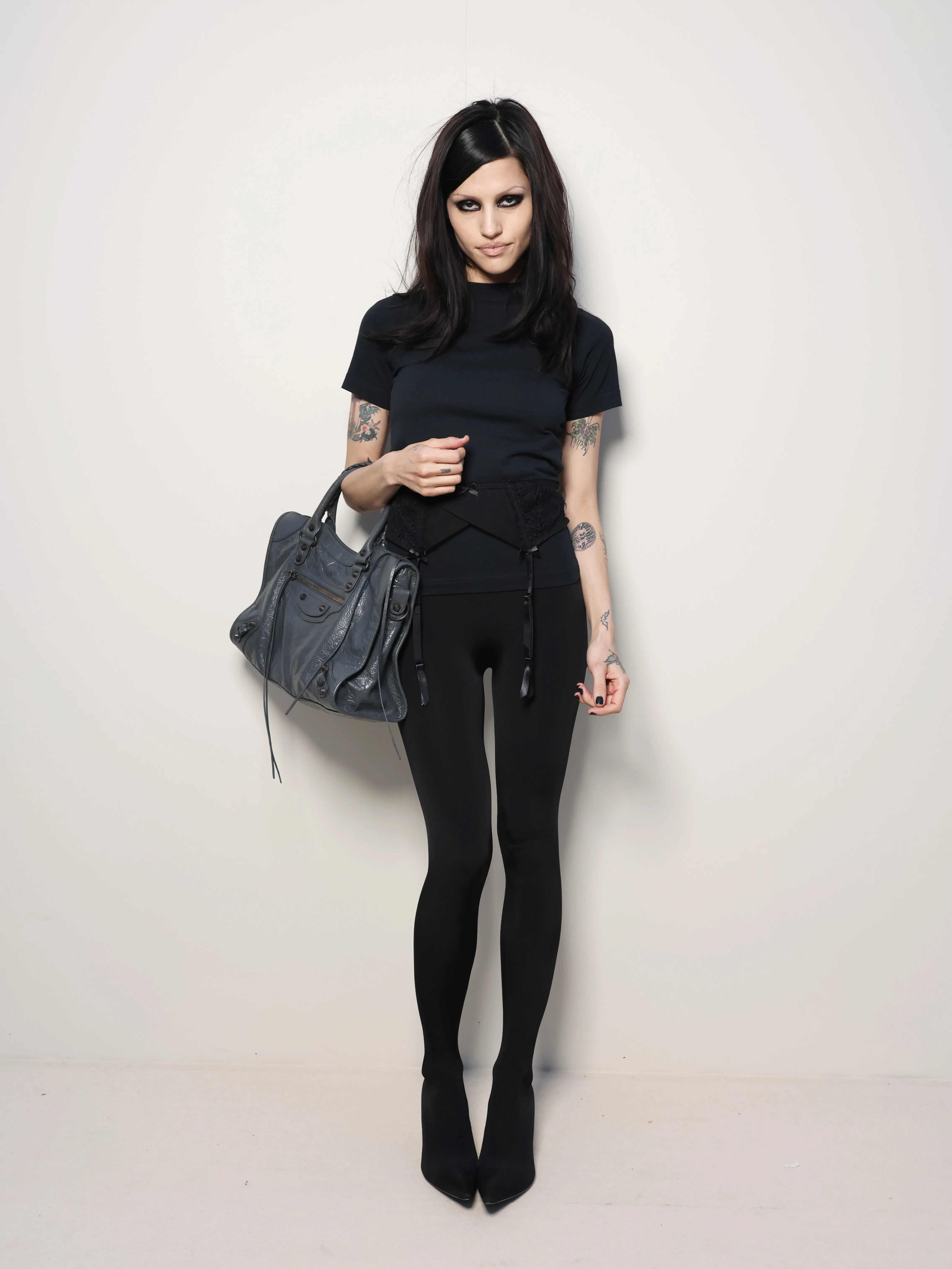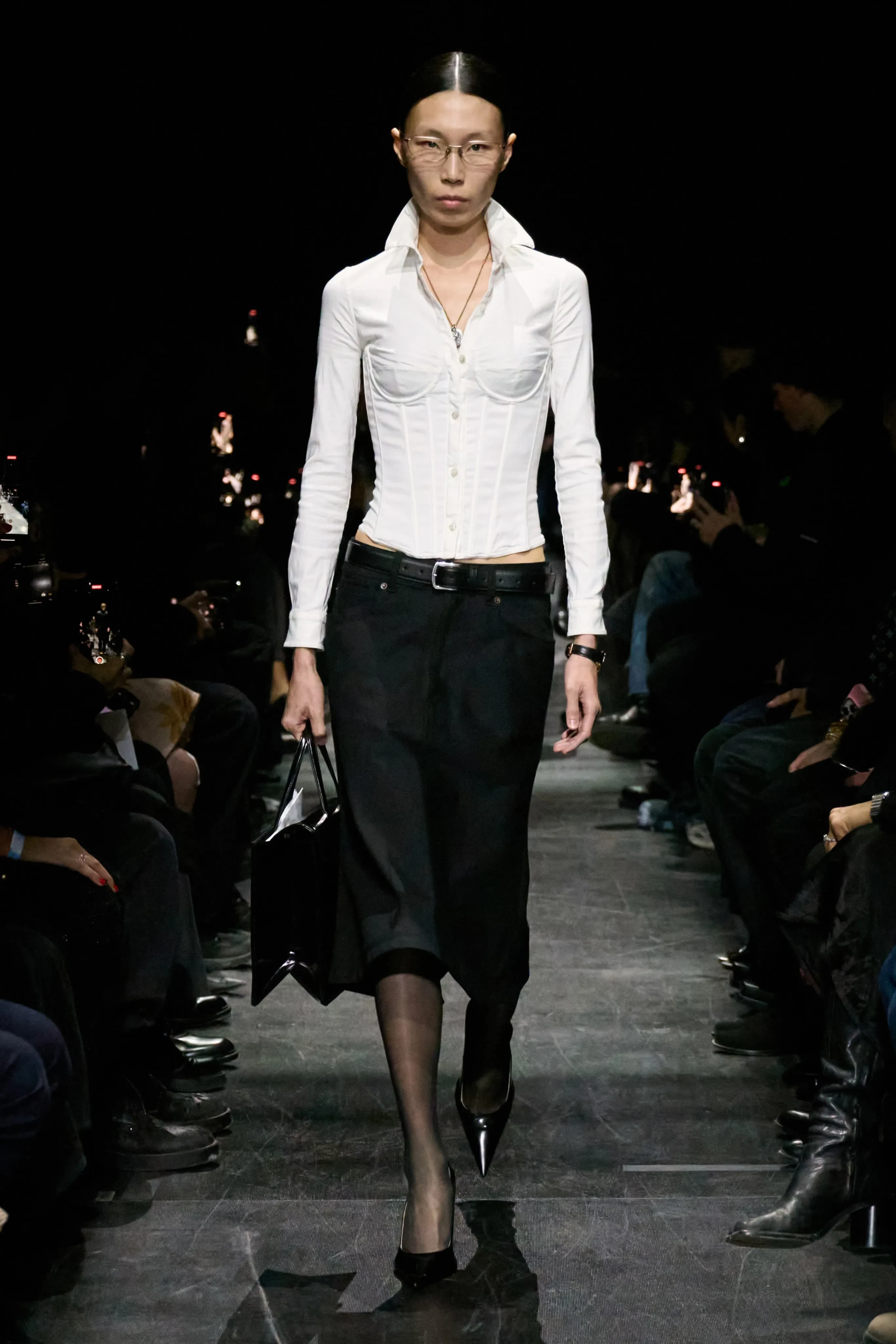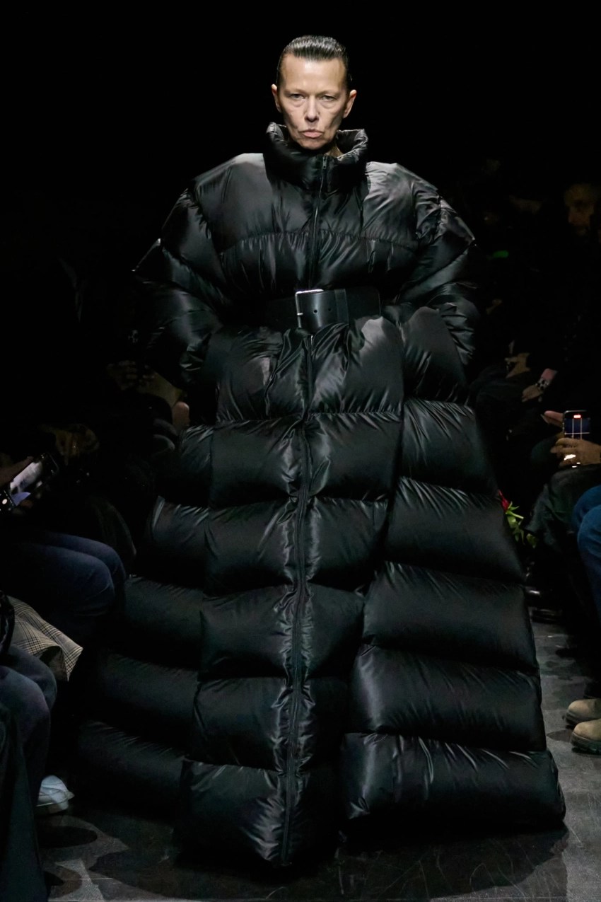 Тайра Бэнкс/Фото: Arnold Jerocki/Getty Images for BalenciagaВ новой коллекции Balenciaga представил 80 луков в узнаваемой эстетике бренда, но Демна Гвасалия максимально сократил количество оверсайз-образов на фоне вернувшегося тренда на худобу и популярности "Оземпика" среди звёзд. Осенью дизайнер предлагает носить в основном облегающие вещи: офискор-образы с блузой с корсетом и юбкой-карандашом, жакеты и пальто приталенного силуэта, длинные шубы с босоножками, кожаные плащи, вещи из 2010-х: пуховики с ремнём на талии, короткие куртки с капюшоном с мехом и джинсовки, а также олимпийки с лаковыми ботфортами, вечерние платья в горошек, ажурные колготки и очки-маски.
