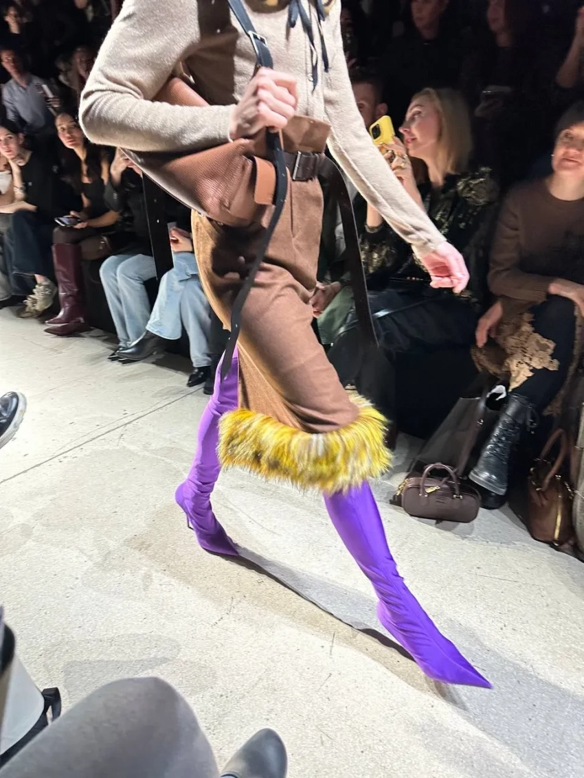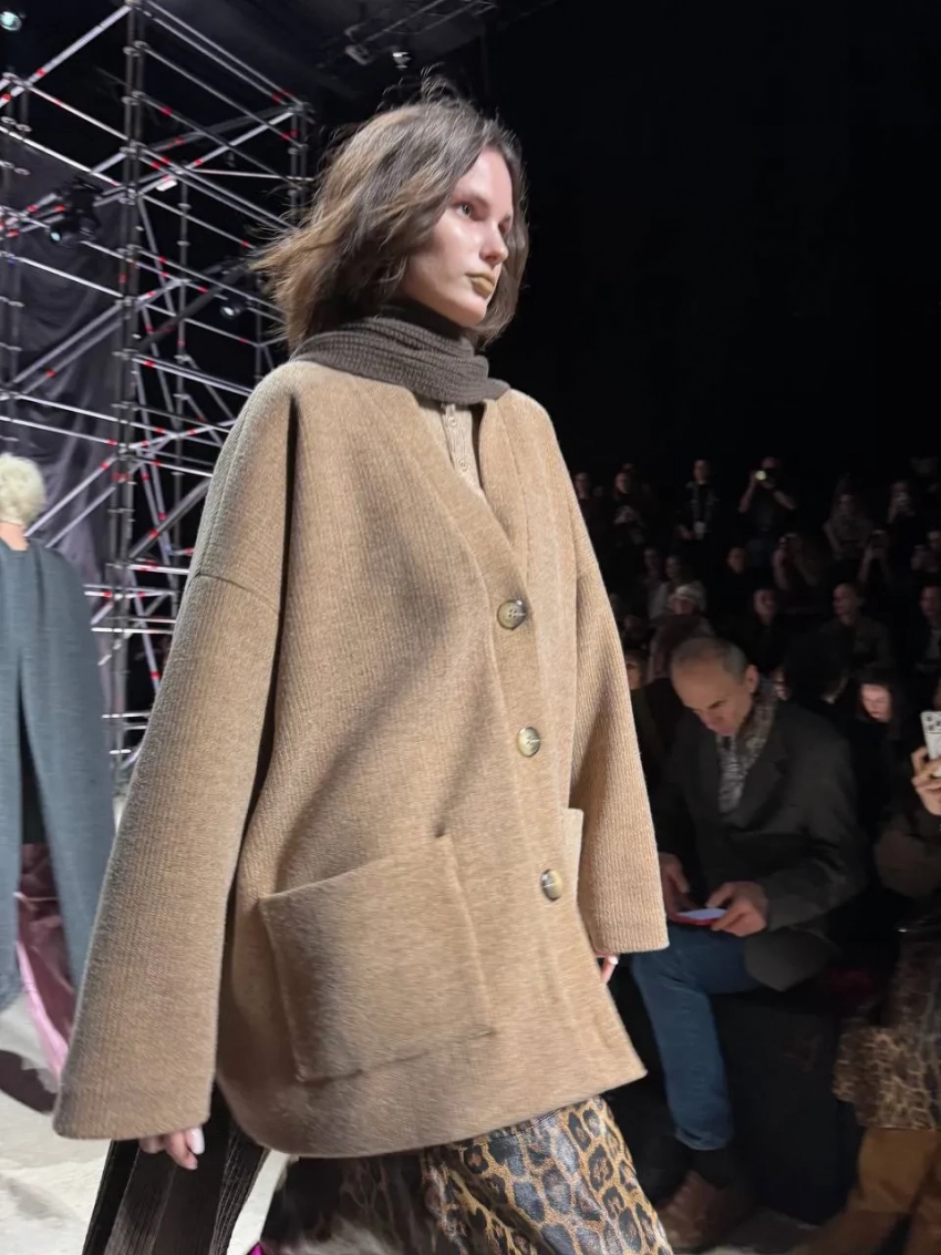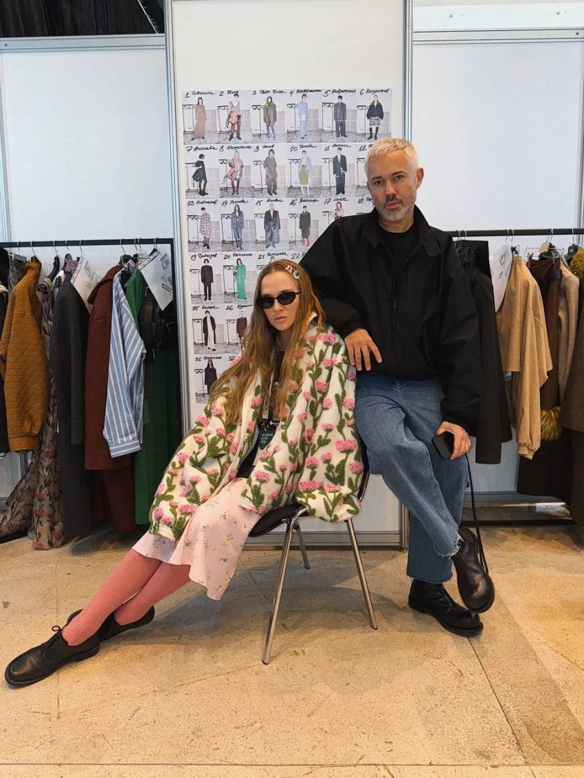 Ольга Шуранова и Александр Рогов/Фото: olga_shuranova/TelegramНа показе Александра Рогова модели носили всё, что будет актуально этой осенью: шубы с цветочным декором и пальто с меховыми воротниками, стёганые юбки, объёмные и приталенные кардиганы, цветные колготки, огромные сумки, серые гольфы, леопард и бархат. Макияж моделей с помадой в тон кожи напоминал о 2010-х, а "отсутствие" укладки — о недавних шоу Prada и Miu Miu.