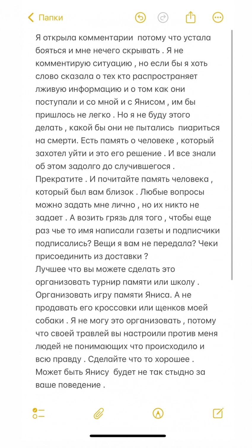 В завершение заявления Анна обратилась к тем, кто обвинял её, и призвала прекратить спекуляции. Она предложила направить усилия на создание турнира или другого мероприятия в честь спортсмена, подчеркнув, что лично её лишили этой возможности: "Лучшее, что вы можете сделать, это организовать турнир памяти или школу. Организовать игру памяти Яниса. А не продавать его кроссовки или щенков моей собаки. Я не могу это организовать, потому что своей травлей вы настроили против меня людей, не понимающих, что происходило, и всю правду".