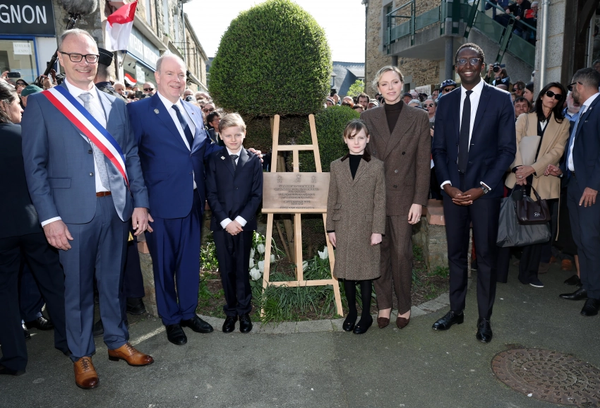 Альбер II и княгиня Шарлен с детьмиСемья приняла участие в открытии мемориальной доски в честь их визита в Матиньон. Напомним, принц Альбер принадлежит к династии Гримальди, которая имеет исторические связи с Бретанью, так как его предки сохранили титулы, связанные с этим регионом.