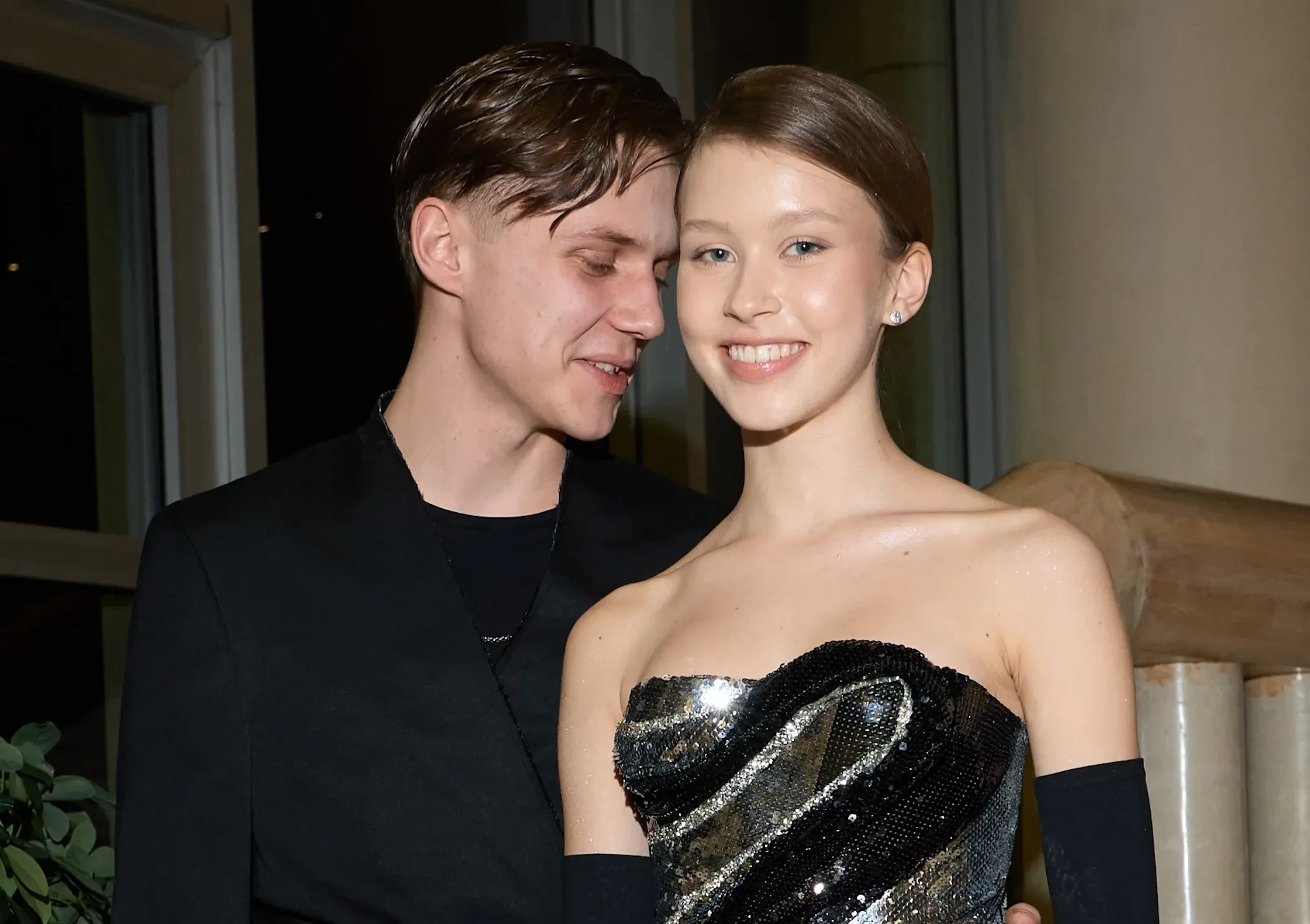 Звезда сериала "Слово пацана" Анна Пересильд и певец Ваня Дмитриенко, которых подозревают в романе, впервые вместе вышли в свет. Они посетили премию журнала Voice, где позировали в обнимку. Для мероприятия 15-летняя Анна, дочь режиссёра Алексея Учителя и актрисы Юлии Пересильд, выбрала чёрно-серебристое платье без бретелей с пайетками и длинные перчатки.