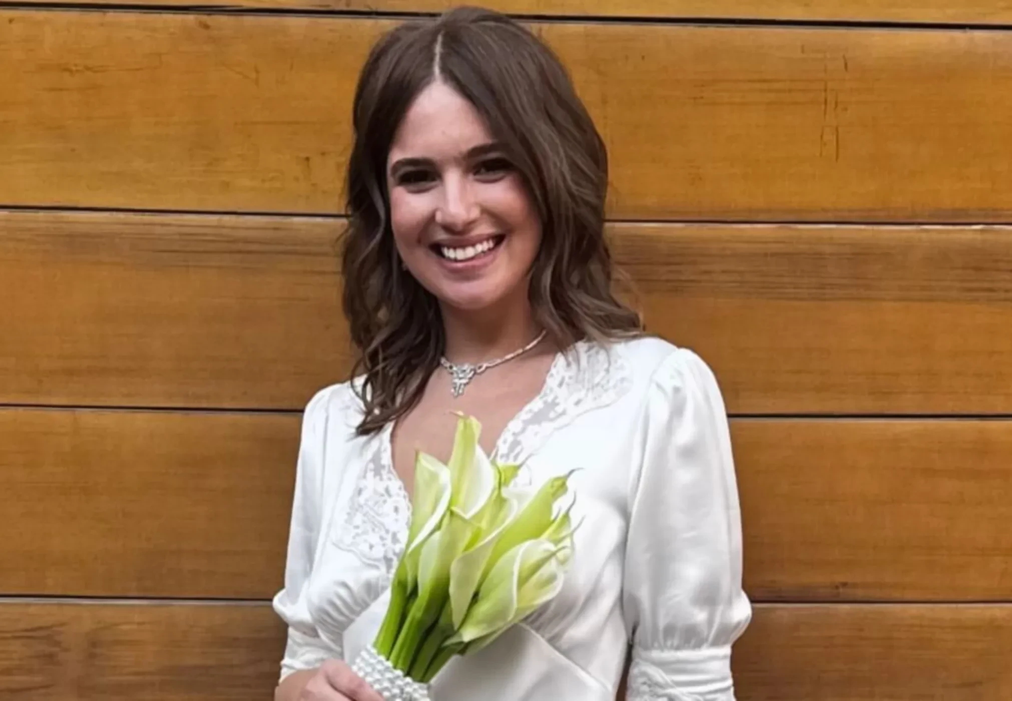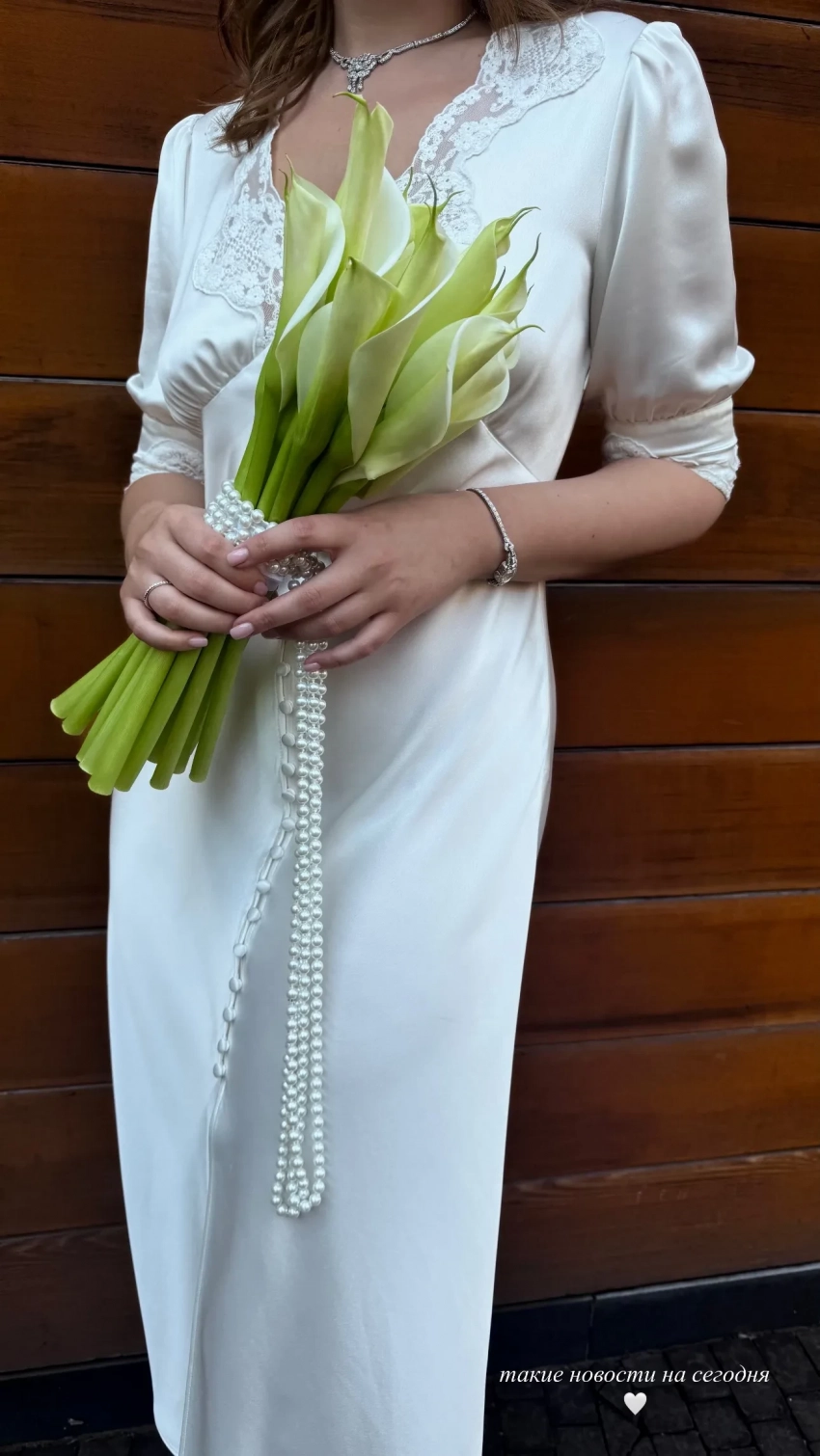 Александра выбрала для церемонии белое платье с рукавом три четверти от британского бренда Rixo. Она дополнила наряд нежно-розовыми туфлями с острым носом, бриллиантовым колье и серьгами. Свадебный букет состоял из белых калл, а вместо привычной ленты были использованы жемчужные бусы.