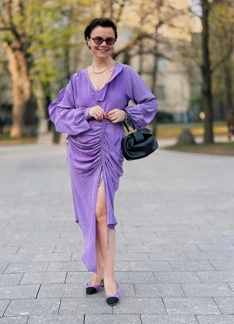 Молодая супруга Петросяна продемонстрировала романтичное сиреневое платье в мелкий горошек и с актуальной сборкой. Образ Татьяна дополнила туфлями в тон наряду и ретро-сумкой. Плюс жемчужные бусы Chanel. Все красиво. Единственное — я бы сняла солнцезащитные очки и сделала макияж поярче. Не знаю, почему Брухунова упорно отказывается от мейкапа.