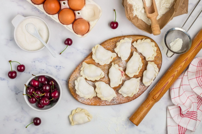 Готовятся как обычные пельмени, но без яиц. В качестве начинки – вишня с сахаром и корицей. Вареники можно заморозить впрок. Готовые подаются с медом или вареньем.