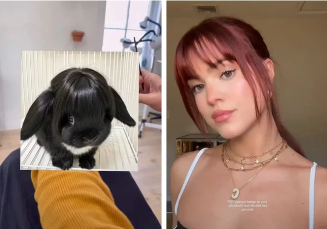 Интересно, что тренд начался с вирусного фото… черного кролика с роскошной «челкой». Пользователи соцсетей настолько прониклись этим очаровательным образом, что начали массово показывать пушистого зверька своим парикмахерам в качестве референса. Так милая идея из интернета стала настоящим модным явлением.