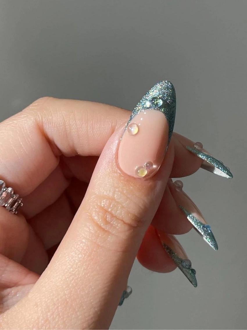 Самый свежий и оригинальный тренд — маникюр с эффектом росы. Прозрачные капли на фоне мерцающей основы напоминают о хрупкости и чистоте свадебного утра. Идеально для тех, кто ценит лёгкость, простоту и нетривиальные решения.